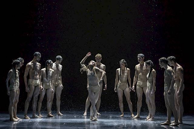 Am Anfang habe ich, ehrlich gesagt, noch gar nicht gewusst, dass wir Wasser benutzen würden. Das hat sich erst im Prozess des Choreografierens so ergeben. Als wir beim «Tanz der Erde» angekommen waren, hat mir die Musik gesagt, dass da etwas vom Himmel fallen müsse. Mir war nicht klar was. Wir haben dann verschiedene Möglichkeiten durchgespielt, und plötzlich ergab das Wasser Sinn, weil es sich ganz aus der Geschichte entwickelt: Wasser als das fruchtbringende und reinigende Element in all seiner Gewalt! In der Introduktion zum zweiten Teil, dem lyrischsten und innigsten Moment der gesamten Sacre-Partitur, kann es dann aber auch eine poetische Qualität entfalten, wenn die Mädchen schwanengleich über das Wasser gleiten.